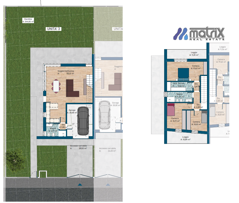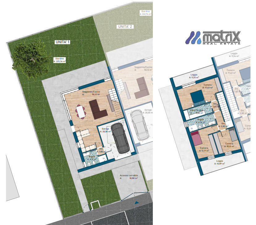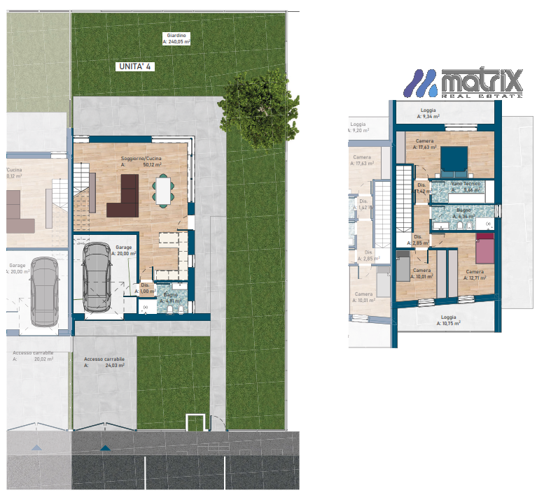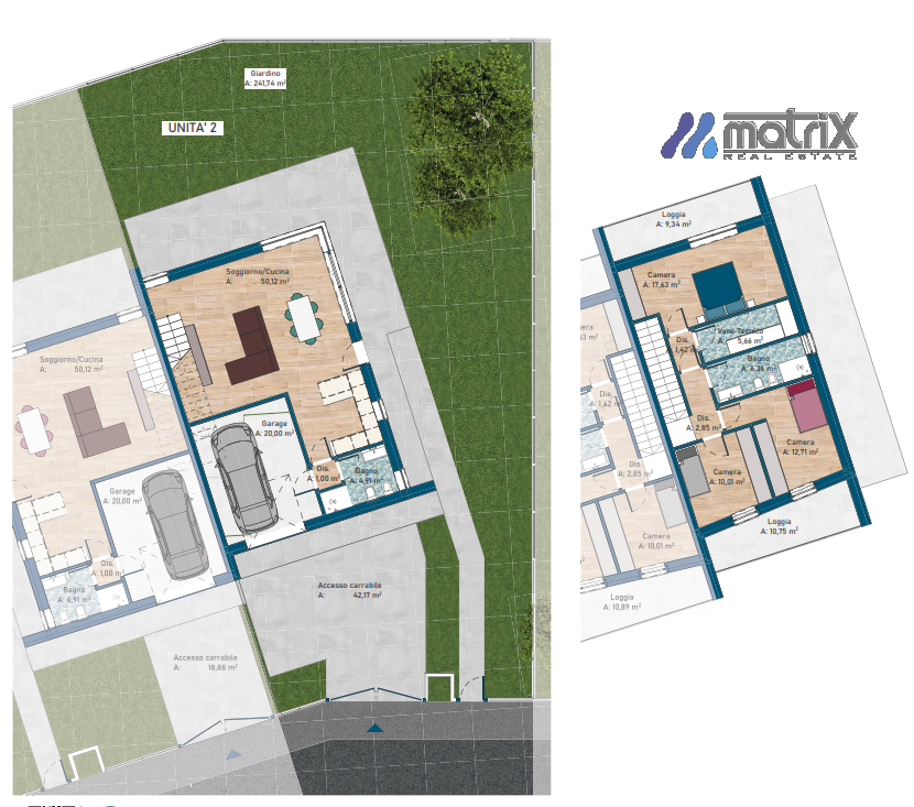 - garage 20 mq più posto auto.