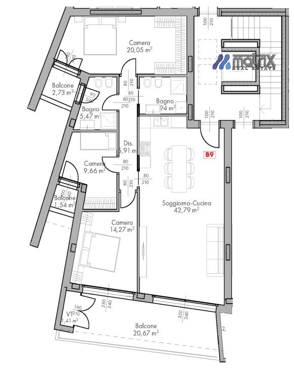 - ingresso soggiorno/angolo cottura di 42,00 mq, porte scorrevoli che portano ad un terrazzo di 20 mq