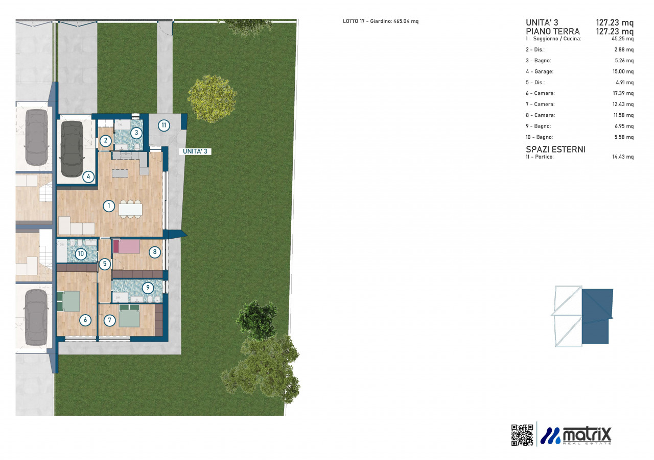 con ampie vetrate scorrevoli che consente l'accesso ad un portico di 14,43 mq. che porta al giardino di 512,62 mq.