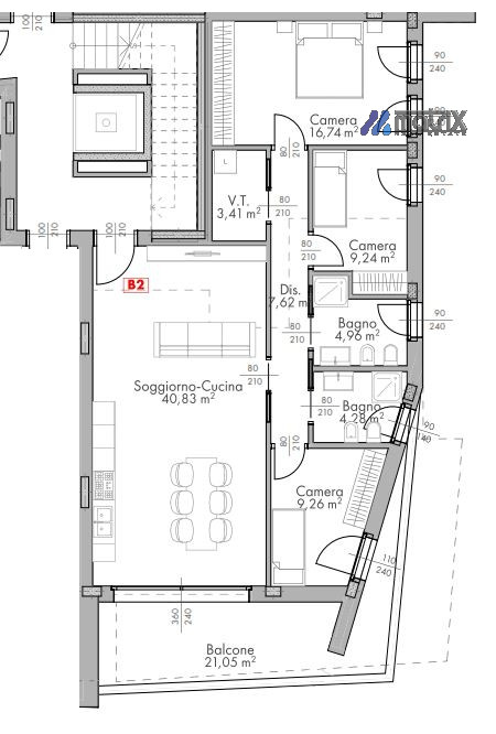 - ingresso soggiorno/angolo cottura di 42,00 mq, porte scorrevoli che portano ad un terrazzo di 20 mq