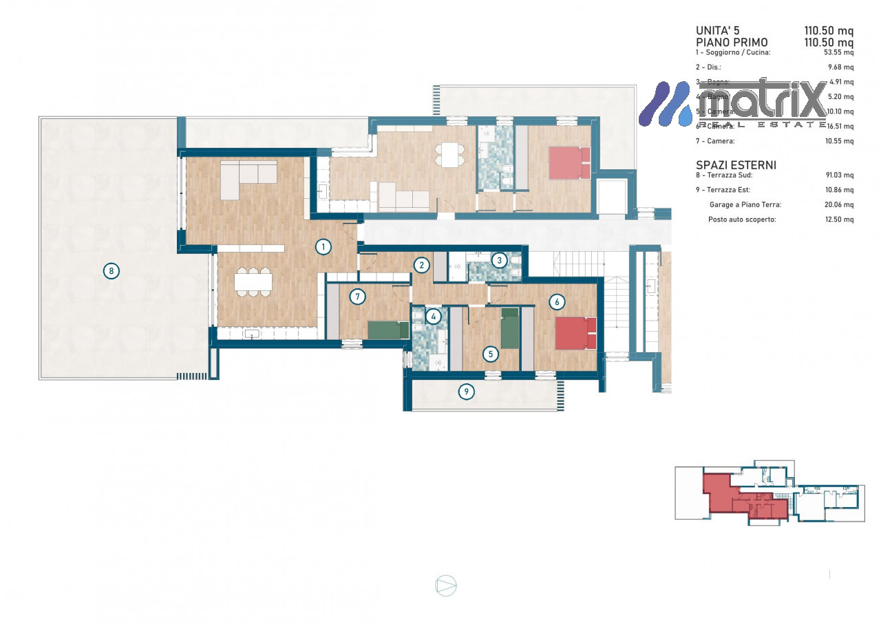 - Terrazzo soggiorno 91 mq, terrazzo nelle camere 11 mq