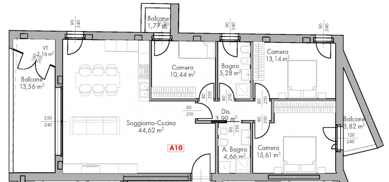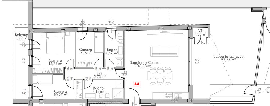 - ingresso soggiorno/angolo cottura di 42,00 mq, porte scorrevoli che portano ad un terrazzo di 20 mq